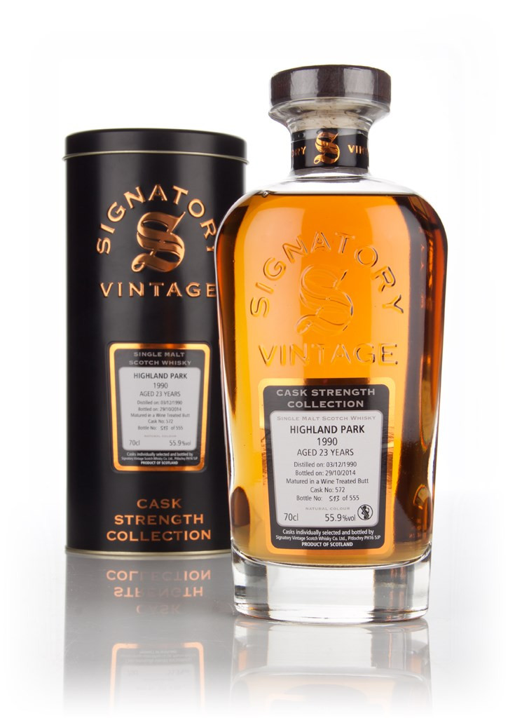 Independently bottled Highland Park single malt Scotch whisky, distilled on the island of Orkney and bottled by Signatory for their Cask Strength Collection. The whisky was put into a single wine-treated-butt in December 1990 and left to mature until October 2014, when it was bottled at 23 year old. 555 bottles were produced.