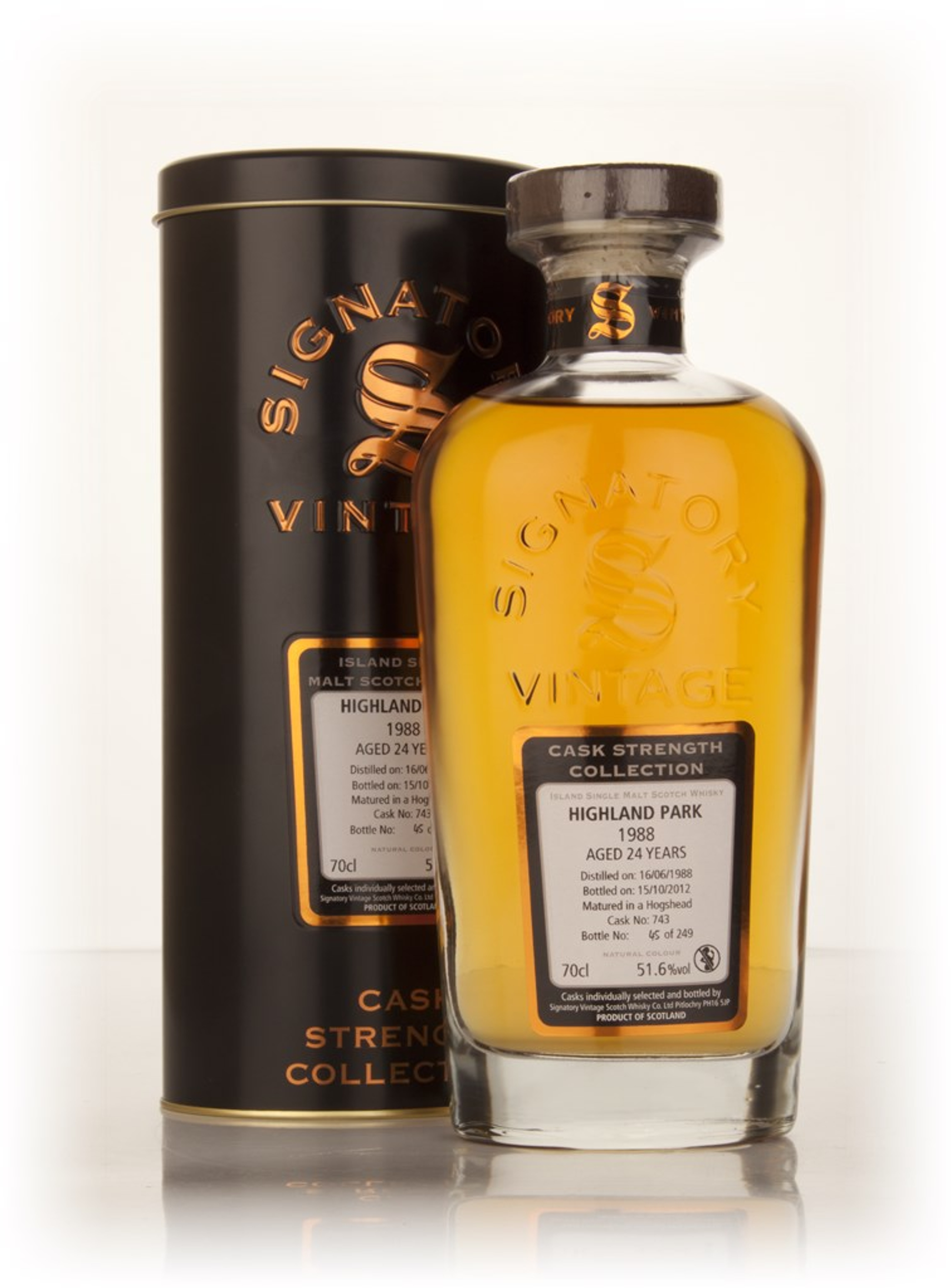 Presented at full cask strength, this 24 year old Highland Park is a revelation from independent bottler Signatory. Distilled in June 1988, it was bottled in October 2012 with an outturn of 743 bottles.