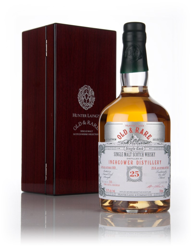 An Old & Rare Platinum bottling of Inchgower single malt Scotch whisky, matured in a single refill hogshead for 25 years. It was distilled way back in October 1989 and left to age until October 2014, when it was bottled by Hunter Laing with an outturn of 266 bottles. Presented with a rather fancy box to house the rather fancy Speyside single malt.
