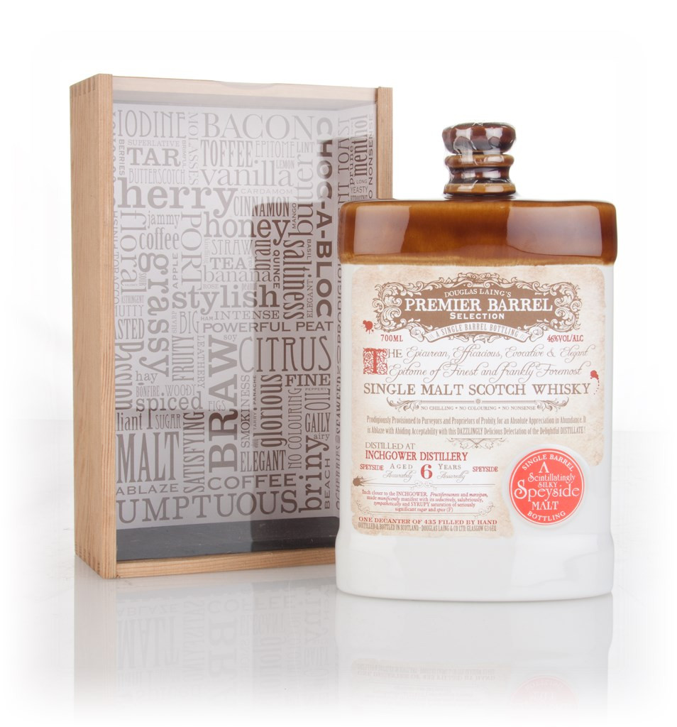 A 6 year old Inchgower, distilled in 2009 at their distillery in Speyside. It was bottled in 2016 by Douglas Laing for their beautiful premier Barrel range, presented in traditionally-styled decanters. 435 of said decanters were produced.