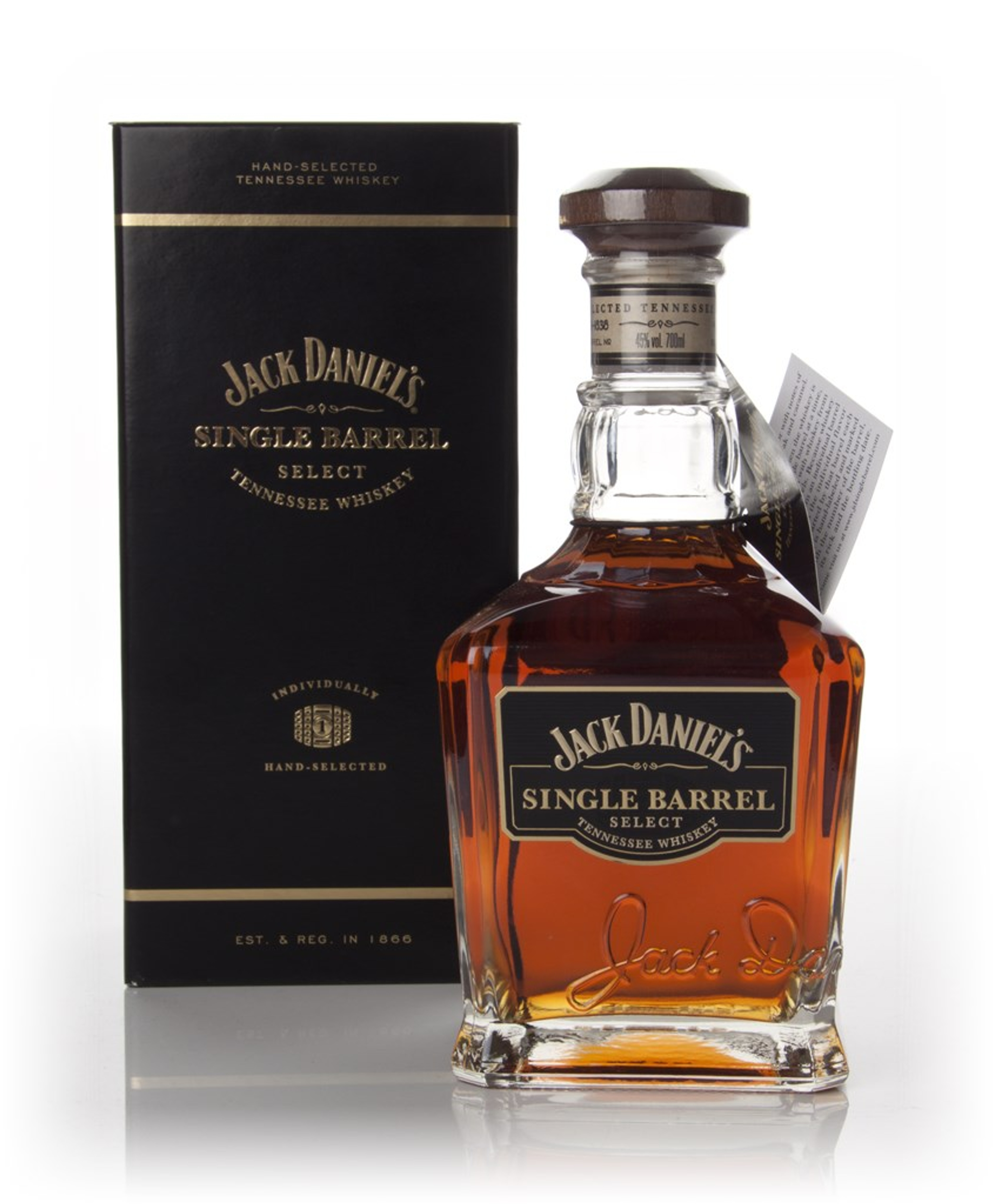 A gift set of Jack Daniel's Single Barrel Tennessee Whiskey, a fancy whiskey with an equally fancy box. The barrels used for the Jack Daniel's Single Barrel are positioned in specific spots in its warehouses where changes in temperature deepen the flavours and colour of the whiskey during maturation.
