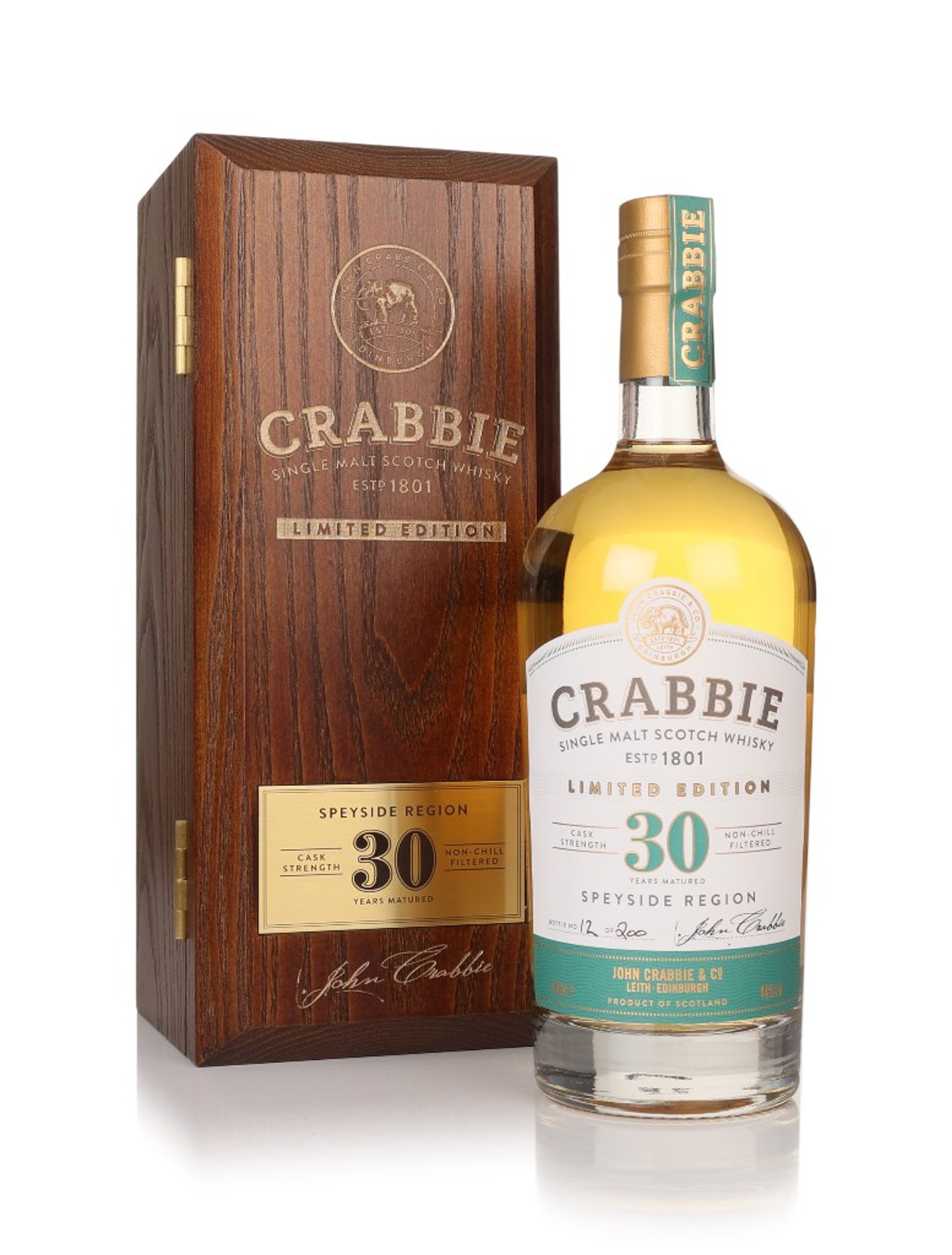A splendidly well-aged limited edition Speyside single malt, hailing from an undisclosed distillery and bottled by John Crabbie & Co. Presented at 30 years old, cask strength, and without chill filtration.