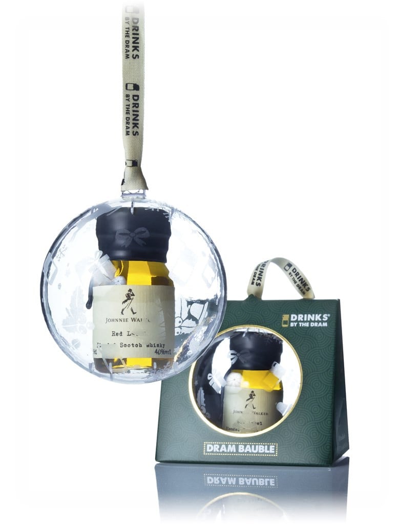 A single plastic bauble from Drinks by the Dram, containing a wax-sealed 30ml sample dram of the famous Johnnie Walker Red Label blended Scotch whisky. Time to replace those tired Christmas Tree ornaments with something delicious. No more glittery wooden snowflakes, no more tinfoil-wrapped slivers of chocolate, and certainly no more boring baubles.