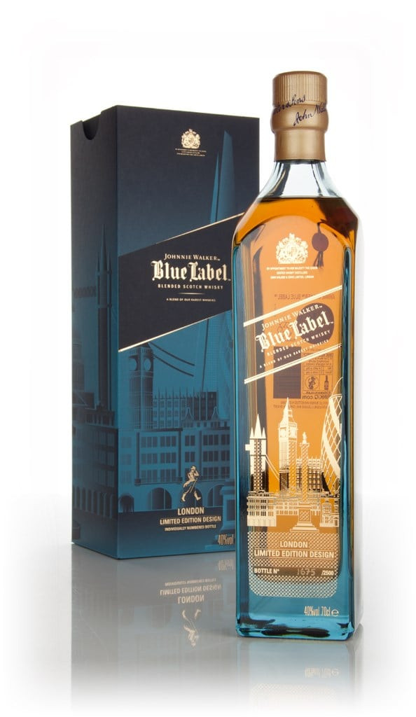 Johnnie Walker's top notch premium blend, Blue Label, presented in a limited edition bottle with a design focused around London and its many landmarks. The bottle and presentation box depict the Gherkin, Nelson's Column, Tower Bridge and Elizabeth Tower.