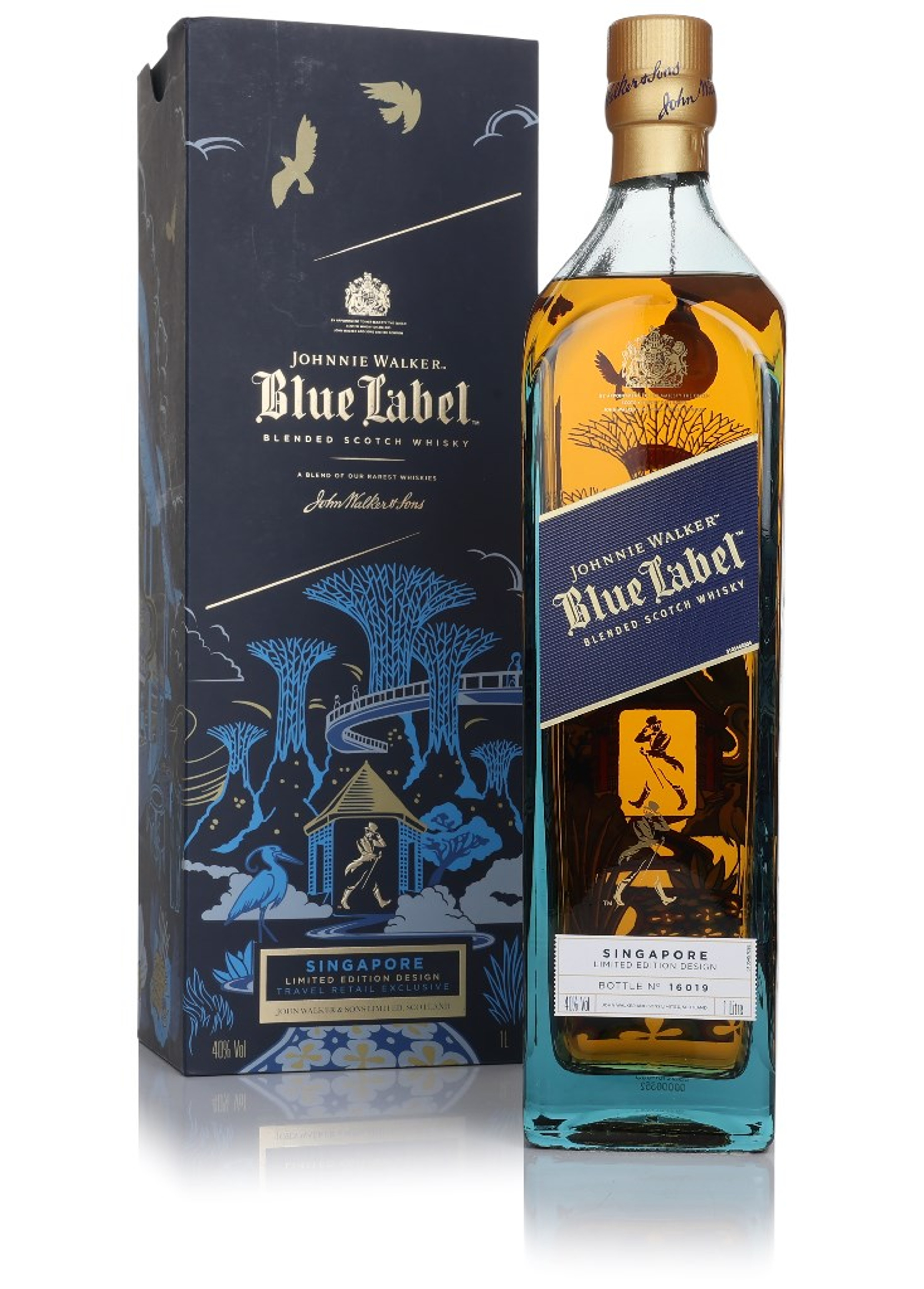 A limited edition one-litre bottle of Johnnie Walker Blue Label blended Scotch whisky, with artwork that celebrates the island of Singapore.