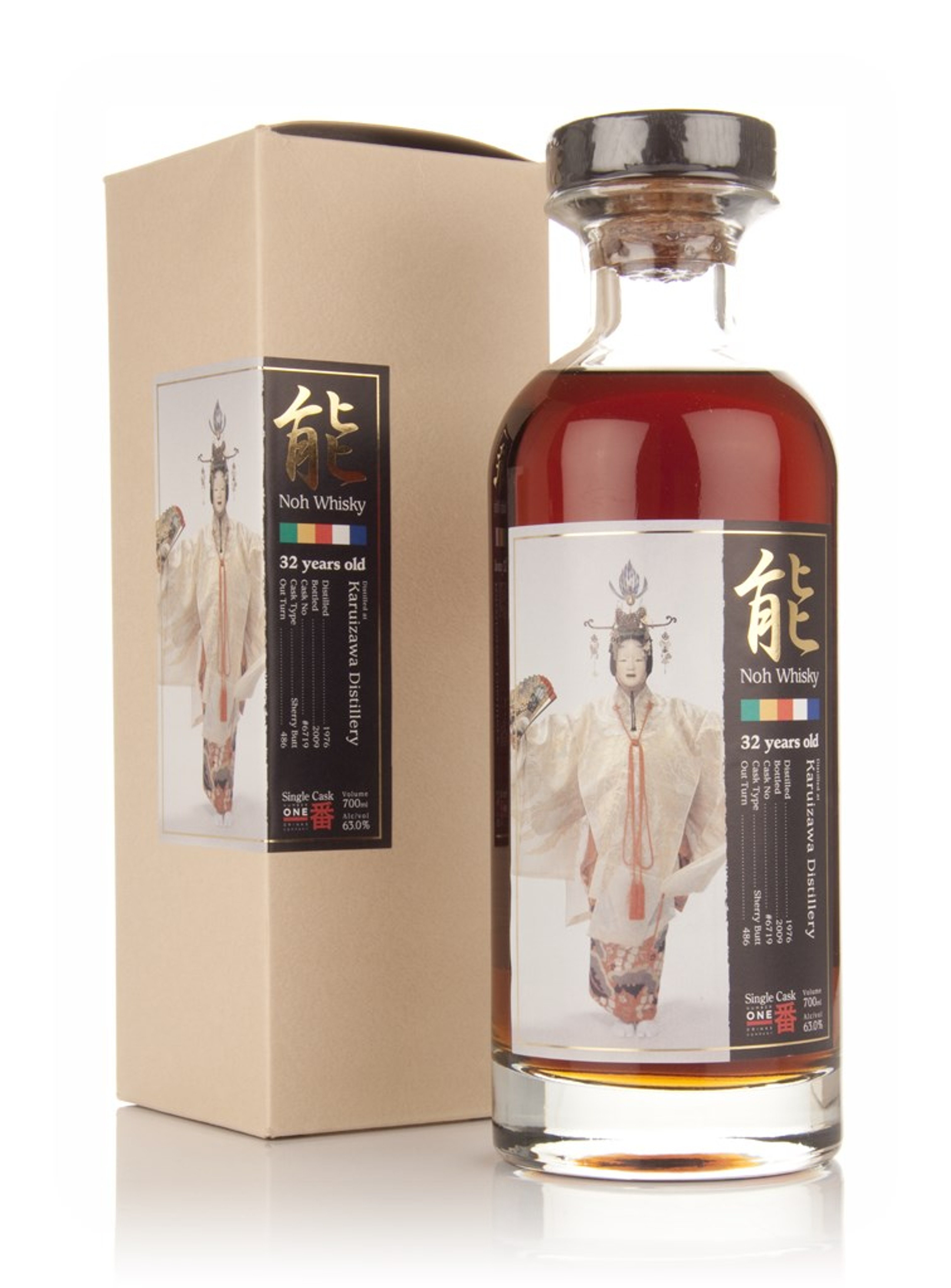A very well aged dram! This 32 year old was distilled at Karuizawa in 1976 and matured in a sherry butt, single cask number 6719. Noh is a form of Japanese theatre, the label features a Noh performer.