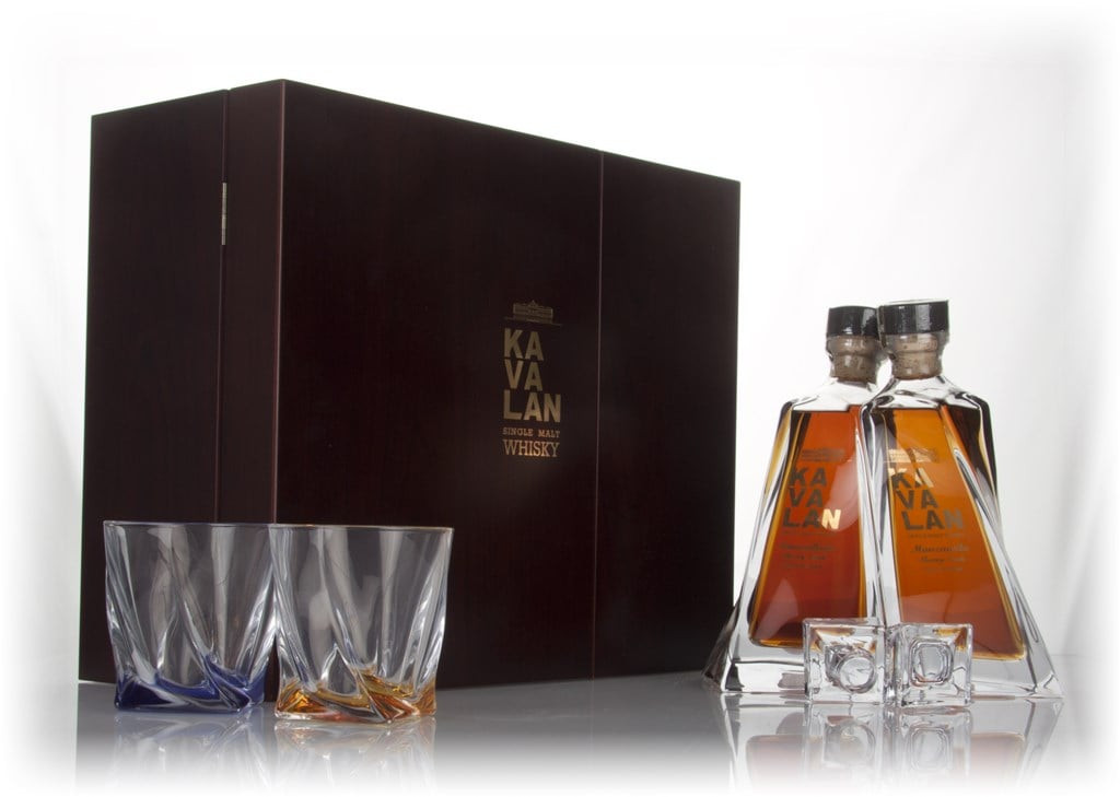 A rather beautiful set from Taiwan's King Car distillery, feature two single malt whiskies from their Kavalan - an Amontillado Sherry cask-matured expression (bottled at 55.6% ABV) and a Manzanilla Sherry cask-matured expression (bottled at 57.8% ABV). These whiskies are presented in two beautifully twisted glass bottles, and come alongside 2 glasses and wooden case.