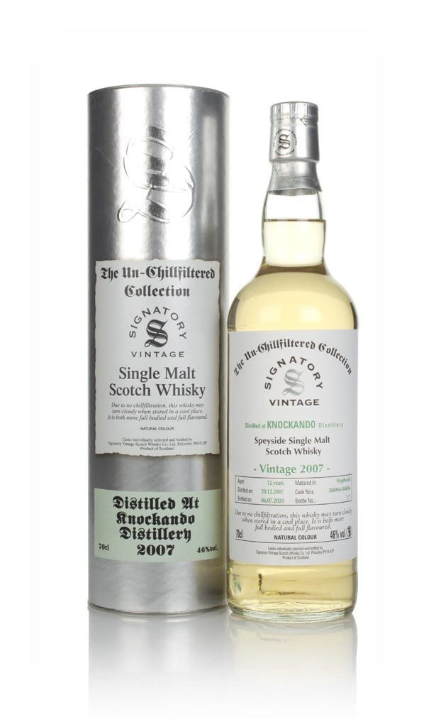 A Signatory bottling of 12 year old single malt from the Knockando Distillery, matured in a pair of hogsheads from December 2007 to July 2020. Knockando is one of those distilleries that doesn't get seen as a single malt very often, and even indie bottlings of it are fairly scarce, so seeing one is always rather interesting indeed.