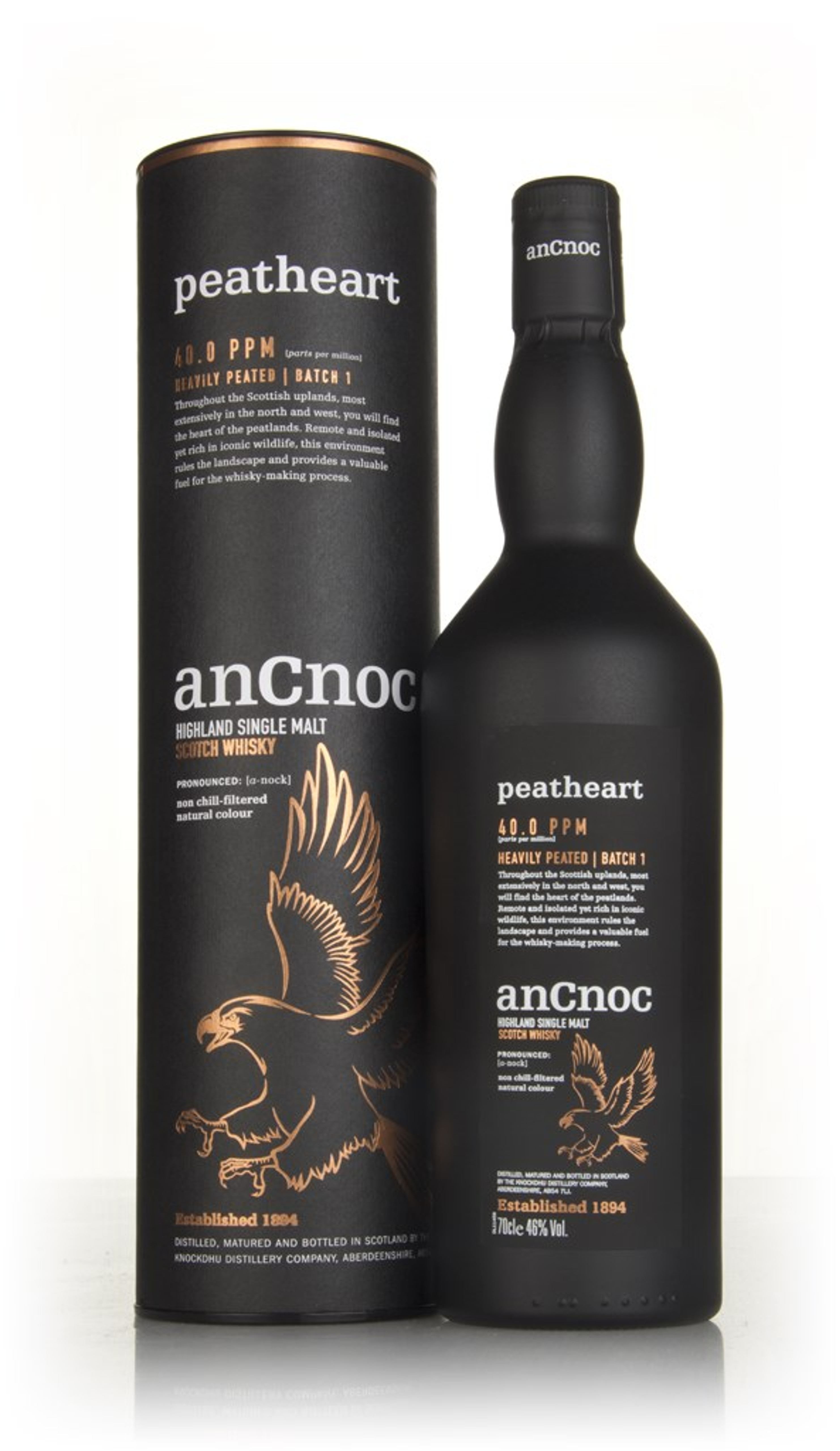 The smokiest whisky from the anCnoc Peaty range - Peatheart! The Knockdhu distillery has used barley malted to 40 PPM (for perspective, Highland Park whiskies sit at around 20 PPM, while Ardbeg whiskies weigh in at about 50-55 PPM) and it was aged in ex-bourbon barrels before bottling at 46% ABV.