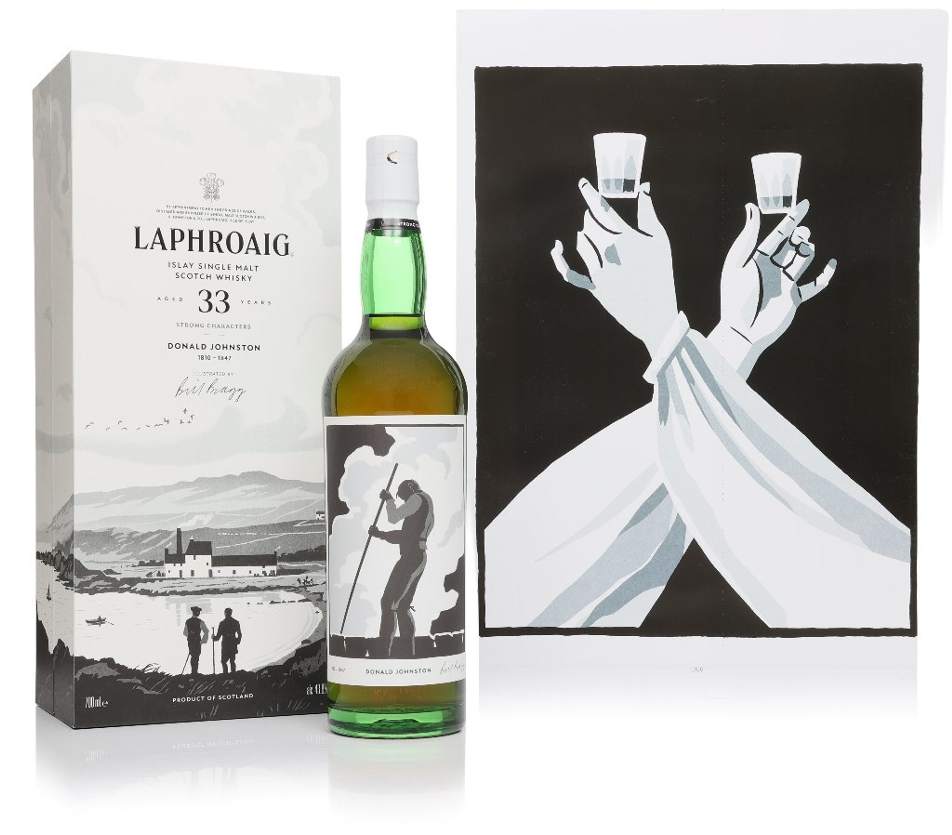 Laphroaig 33 Year Old Strong Characters is a single malt Scotch whisky that celebrates the history of the Laphroaig distillery and the strong characters that have contributed so significantly to it. In this case, the distillery co-founder Donald Johnston, who set up the distillery with his brother, Alexander, in 1815. He features on the whisky’s packaging in an illustration by artist Bill Bragg, who will also illustrate each edition in the series. This Islay whisky was aged for 33 years in a combination of American oak barrels and European oak sherry hogsheads, giving it a distinctive smoky character and robust flavour profile. It was bottled at 43.8% ABV.