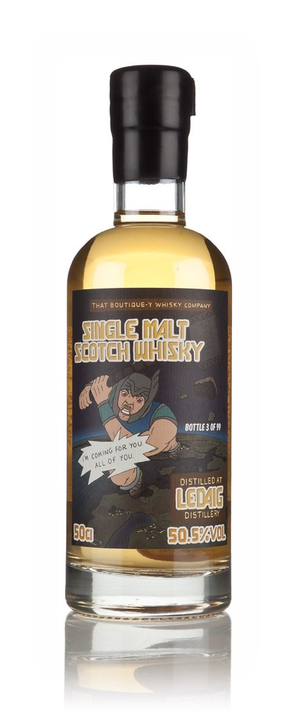 The second batch of That Boutique-y Whisky Company's Ledaig single malt Scotch whisky once again features an incredibly angry looking chap, flying through the air as if he was Neo from the Matrix with a rather large sledgehammer, on his way to thoroughly ruffle some feathers. But where's he going? Islay, of course! He's off to show that the peatiness of Ledaig whisky can put up a fight against the Islay giants.
