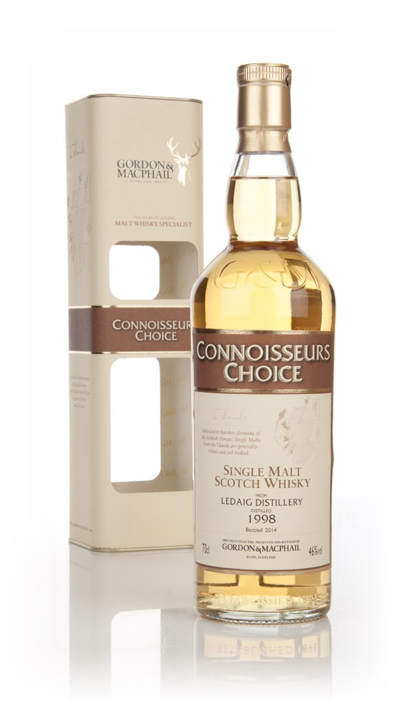 Peated single malt from the Tobermory distillery, released under their Ledaig name. It was distilled in 1998 and matured in refill Sherry hogsheads until 2014, when it became a member of the Connoisseurs Choice range from Gordon & MacPhail.