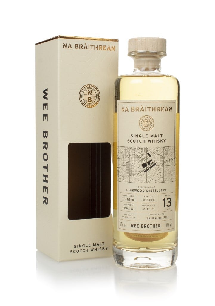 One of two single malts from Linkwood to be bottled up by Na Bràithrean, and this one is the Wee Brother edition. Y'see, Na Bràithrean get a cask of whisky, split it in two (the whisky, not the cask – the team doesn't just go around chopping casks in half with their bare hands), and finish the two portions in different casks. The first one to be bottled is the Big Brother, the second one to be bottled is the Wee Brother. This one was given a finishing period in a rum quarter cask, imparting a helping of tangy, spicy, fruity notes.