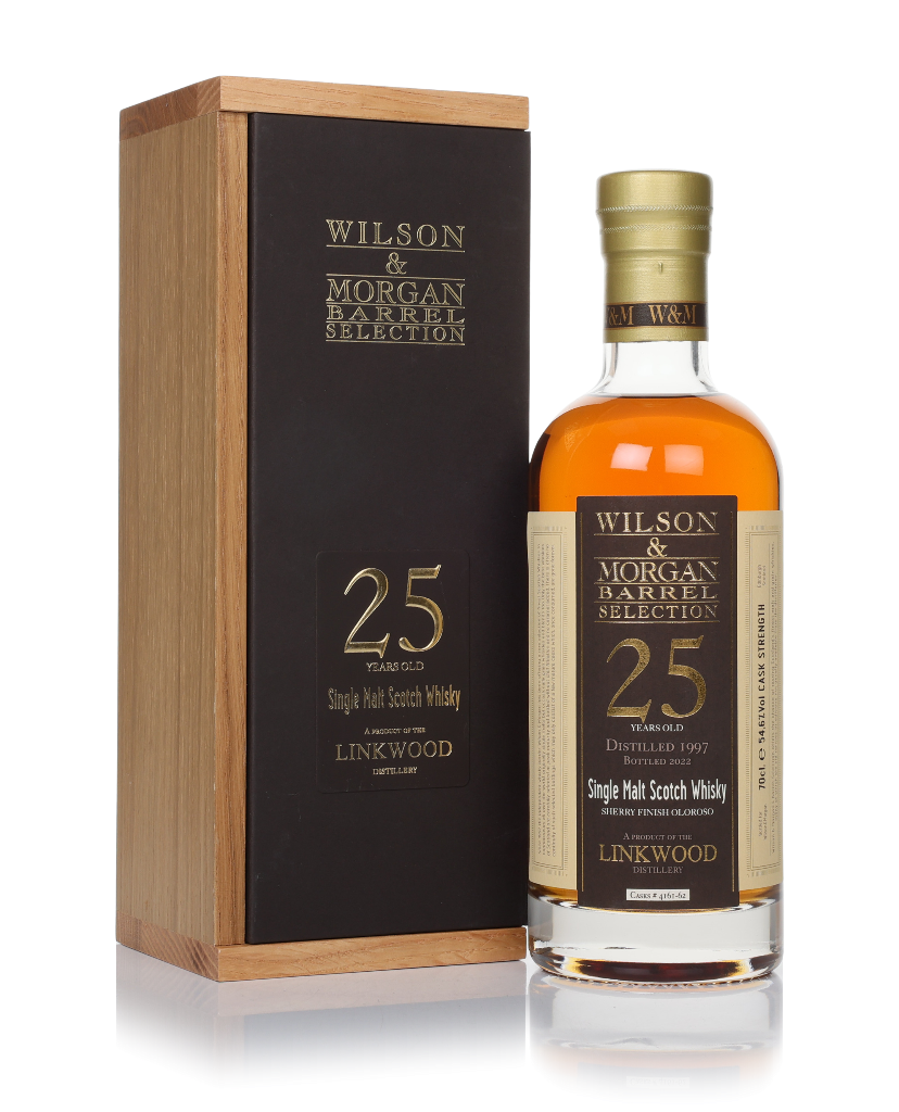 Spectacular Speyside single malt Scotch here, distilled in 1997 at Linkwood and matured for 25 years with an oloroso sherry finish. The whisky was bottled at cask strength by indie bottlers Wilson & Morgan for its Barrel Selection series.