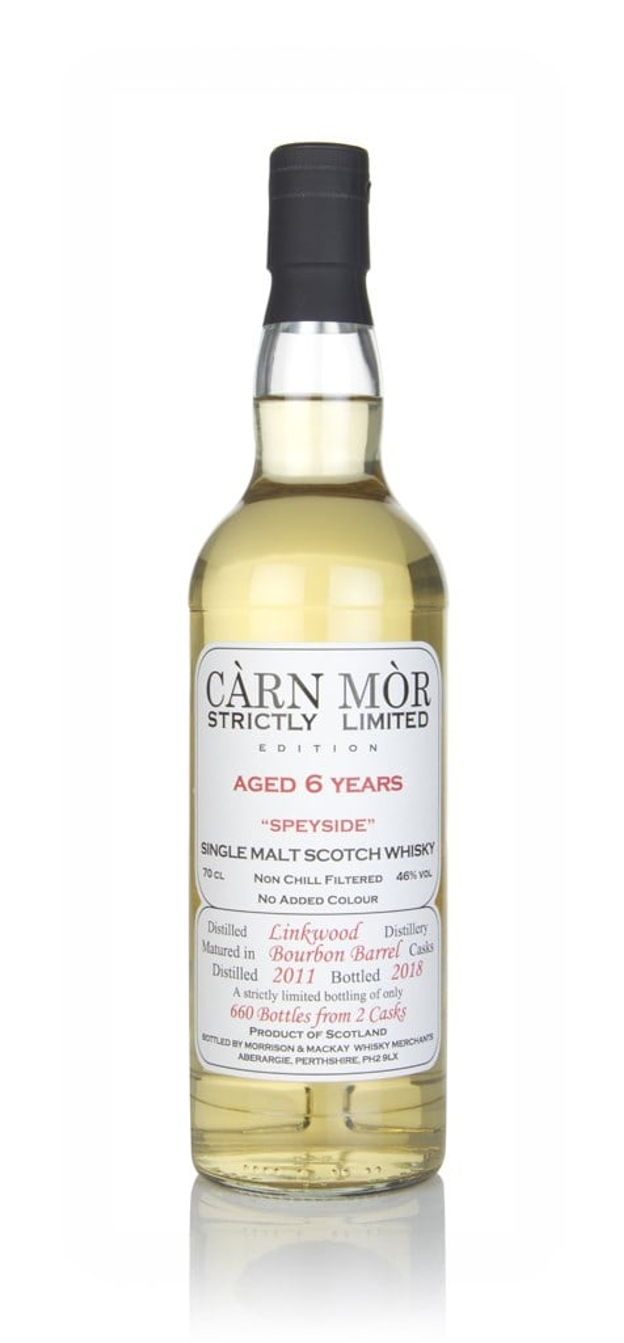 A Càrn Mòr bottling of 6 year old Linkwood, drawn from a pair of ex-bourbon barrels filled in 2011 and cracked open in 2018. It was bottled without any additional chill-filtration or colouring at 46% ABV with an outturn of 660 bottles.