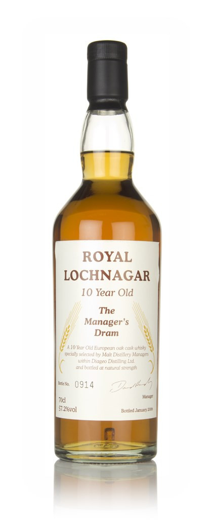 This is a 10 year old single malt from the Royal Lochnagar distillery, which overlooks Balmoral. The whisky itself was released as part of The Manager's Dram series, which are selected by distillery managers and made available to Diageo employees. It was bottled at cask strength back in January 2006.