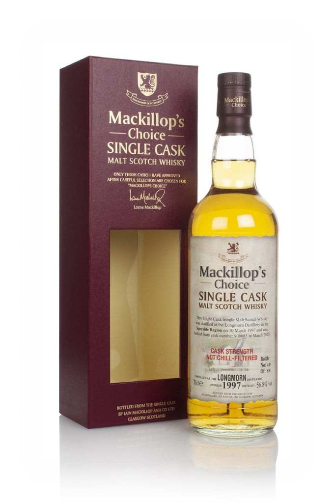 A 1997 vintage Longmorn single malt, drawn from a single cask that matured the whisky until March 2020. Following that rest, this expression was independently bottled for the Mackillop's Choice range at cask strength with a small outturn of only 86 bottles.