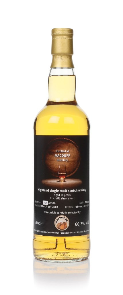 Marvellous single malt from Macduff! Distilled in March 2003, this expression was filled into a single sherry butt, where it remained for 14 years. In February 2018, the cask was cracked open, and a total of 526 bottles were independently released by Fadandel.