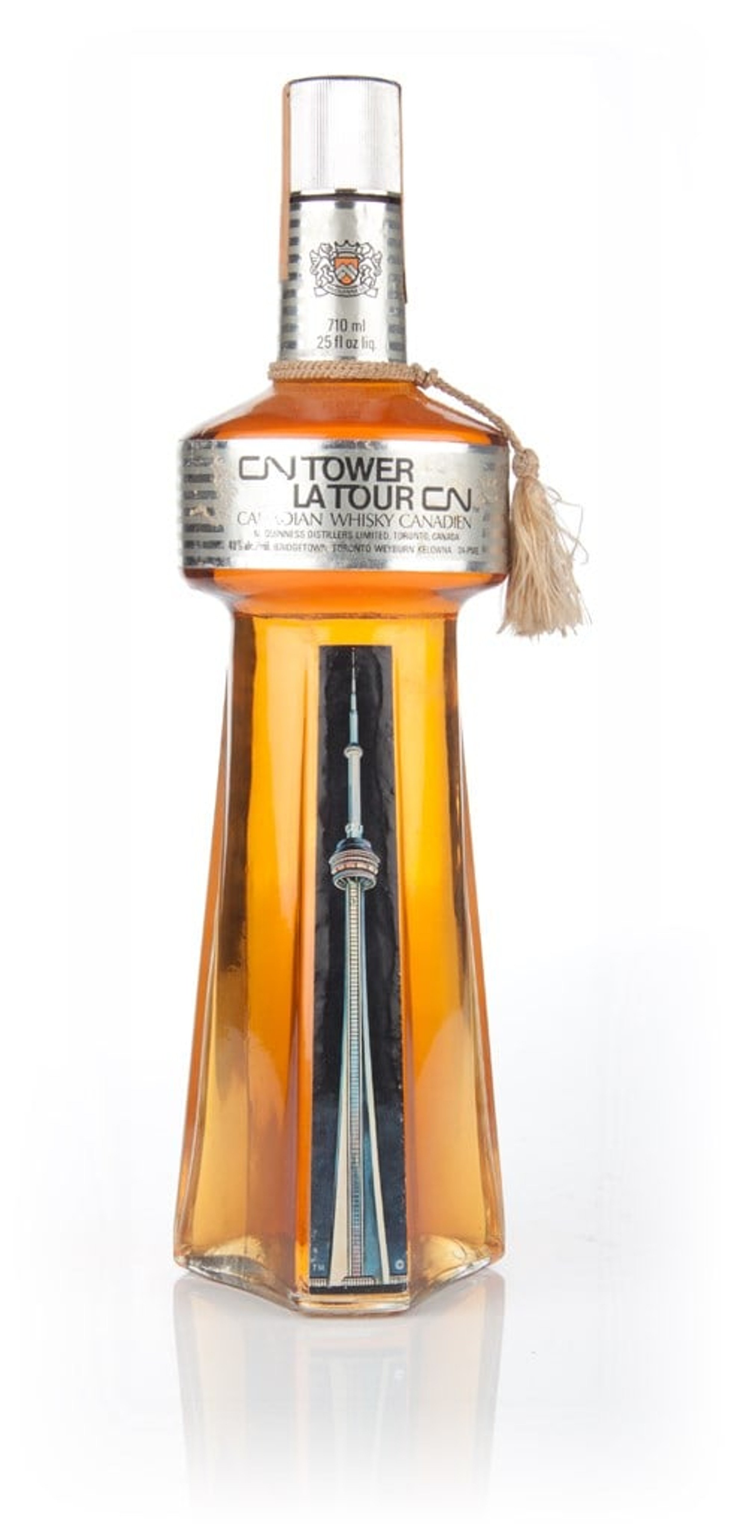 A rare, antique bottle of McGuinness Canadian Whisky, presented in a bottle which looks like a much, much, much smaller version of the CN Tower in Toronto, Canada. We believe this bottle was produced in 1970.