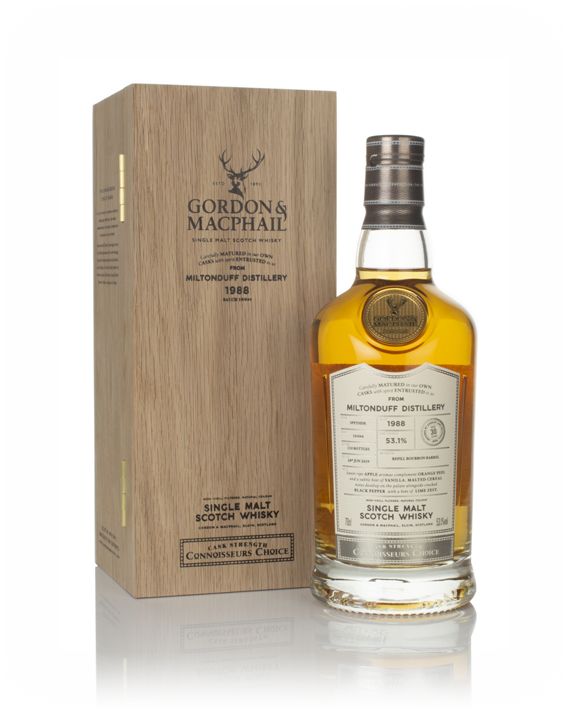 This awesome Miltonduff has seen a stunning 30 years of ageing, and has been bottled up thanks to Gordon & MacPhail. The single malt was distilled all the way back in 1988, and left in a refill bourbon barrel for three decades. In June 2019, it was bottled at cask strength for the Connoisseurs Choice series, with an outturn of 110 bottles at 53.1% ABV.