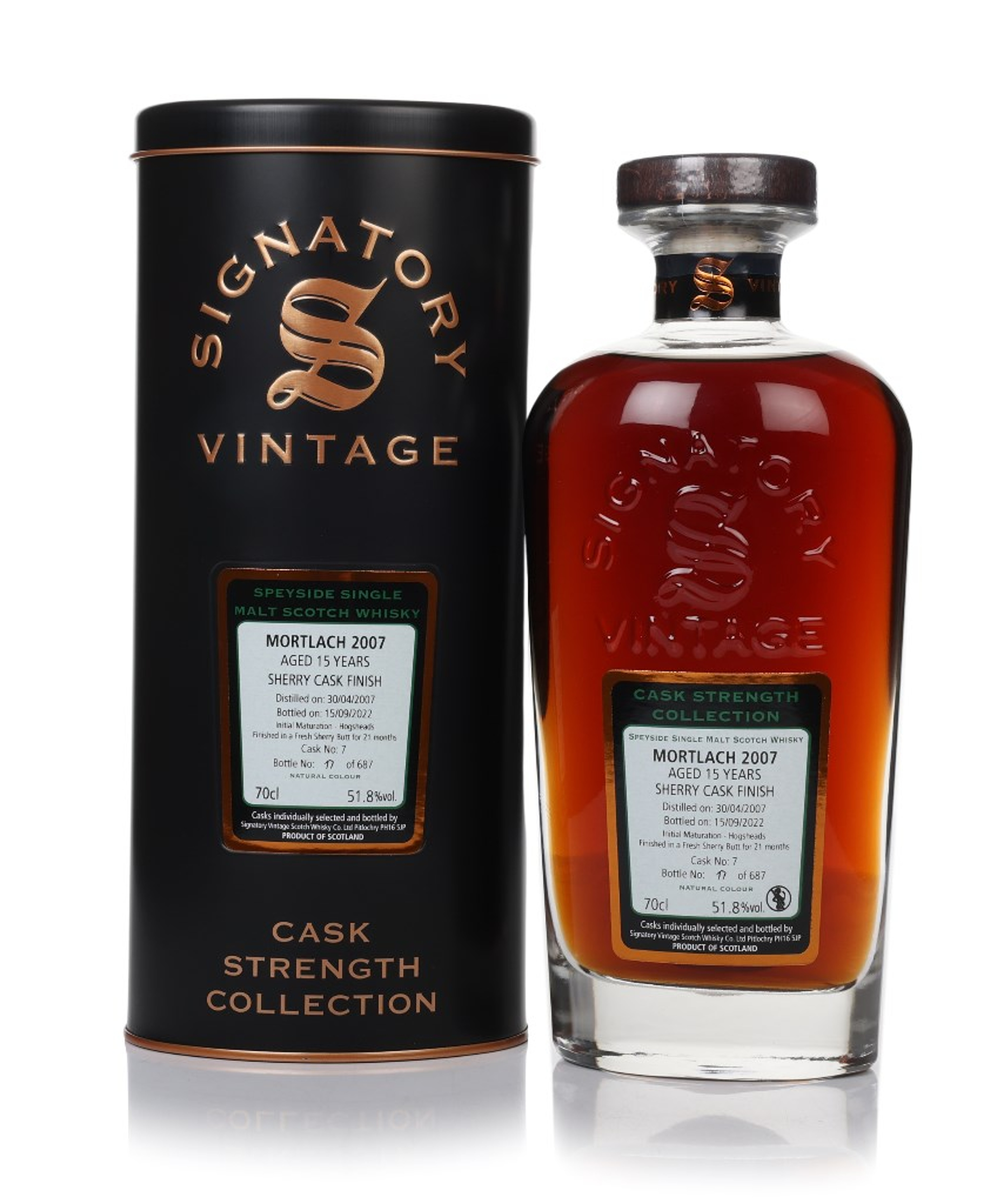 An impressive addition to The Cask Strength Collection from indie bottler Signatory, distilled at Mortlach in April 2007. The single malt spent 15 years maturing, including 21 months in a fresh sherry butt, which yielded a total of 687 bottles when it was opened in September 2022.