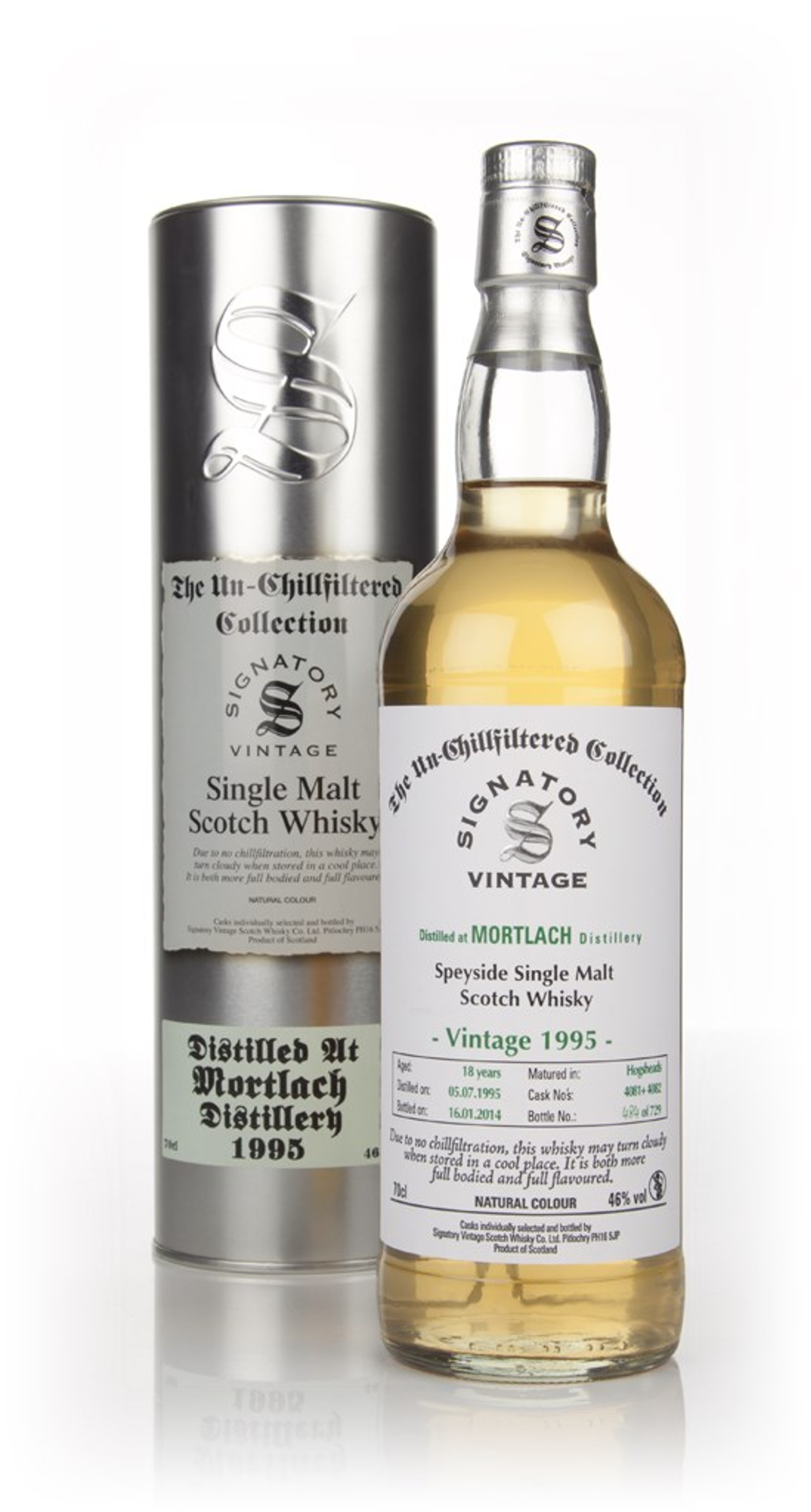 Not even one drop of whisky has been chillfiltered for this Signatory release of Mortlach single malt Scotch whisky. Drawn from two consecutive hogshead that matured the whisky for 18 years with an outturn of 729 bottles.