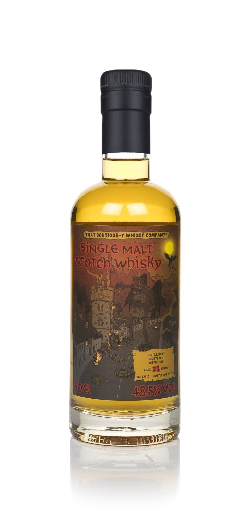 21-year-old single malt from Mortlach, independently bottled by That Boutique-y Whisky Company. The label shows The Beast of Dufftown causing mayhem in the streets, rolling people around in whisky barrels!