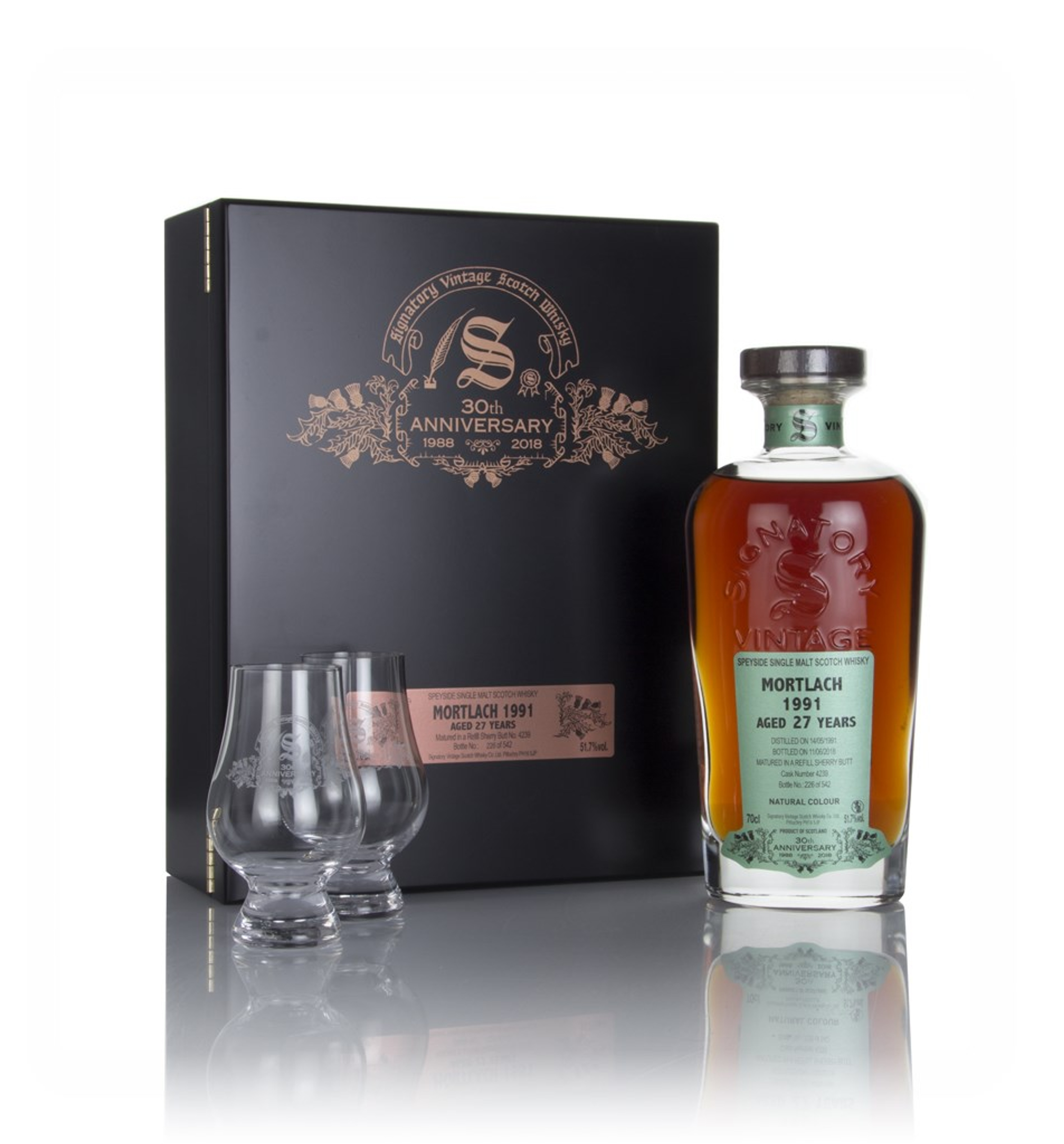 Well sherried Mortlach - what a way to celebrate your 30th anniversary! This is a special edition bottling from Signatory, released as part of its 30th anniversary celebrations. The whisky was distilled by Mortlach in may 1991 and left to age in a single refill sherry butt for 27 years, before being bottled in June 2018. 542 bottles were produced, each one presented with a case and a pair of tasting glasses.