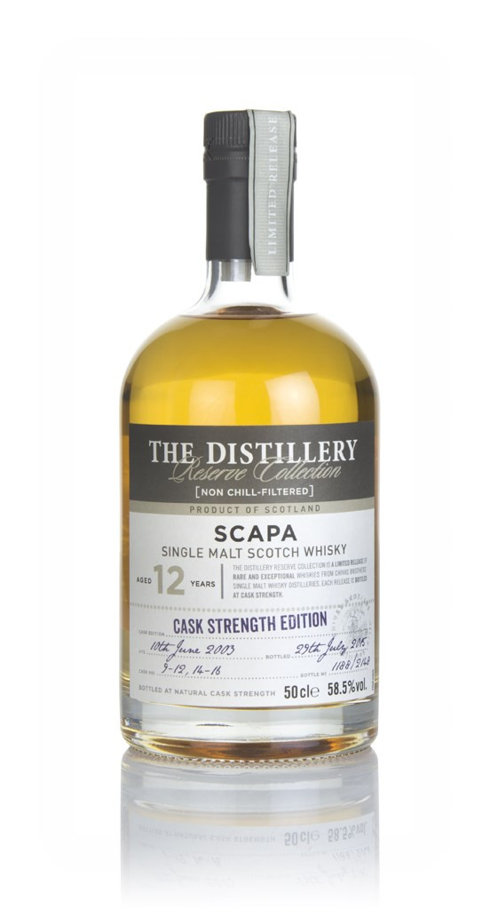 Part of the Distillery Reserve Collection, this non chill-filtered 12 year old Scapa cask strength single malt Scotch whisky was distilled in 2003 and bottled in 2015 at 58.5% ABV.