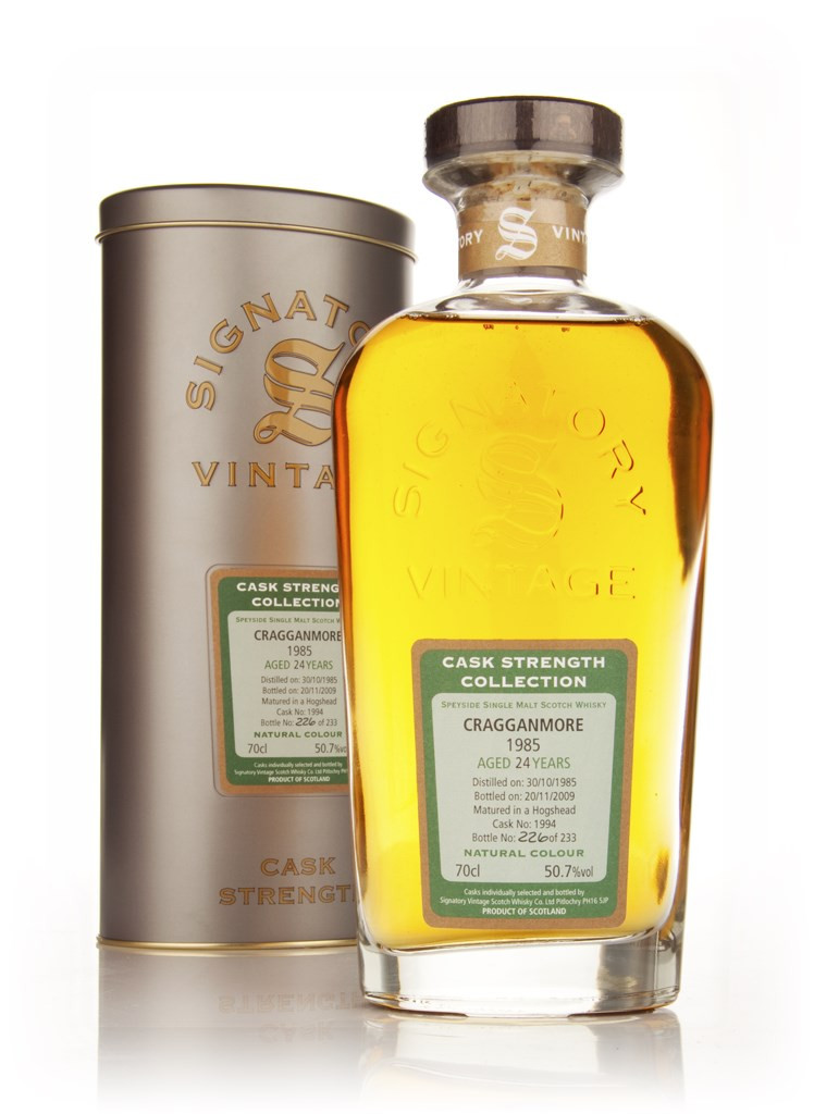 24 year old Speyside whisky from the Cragganmore distillery. This was distilled on the 20th October 1985 and aged in hogshead number 1994 before bottling on the 20th November 2009. A release of 233 individually numbered bottles at cask strength. Presented in stunning decanter bottles.