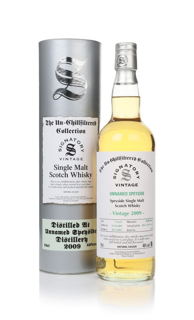 Mystery Speyside single malt, independently bottled by Signatory for the Un-Chillfiltered Collection. This one was distilled in Speyside... Somewhere... Back in 2009, and matured in refill butt casks for 12 years, before it was bottled up at 46% ABV. No chill-filtration, and no clues as to which distillery it came from.
