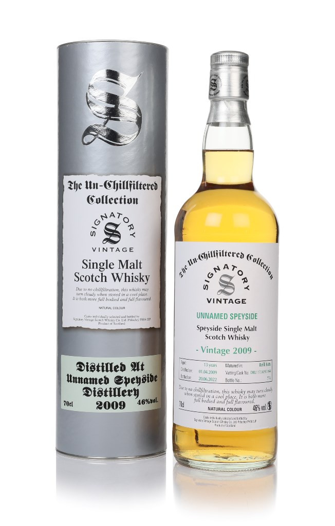 Mystery Speyside single malt from Signatory, distilled in April 2009 and rested in a refill butt for 13 years. In June 2022 the whisky was bottled for the Un-Chillfiltered Collection, with those classic Speyside flavours of fresh fruit, creaminess, and gentle spices.