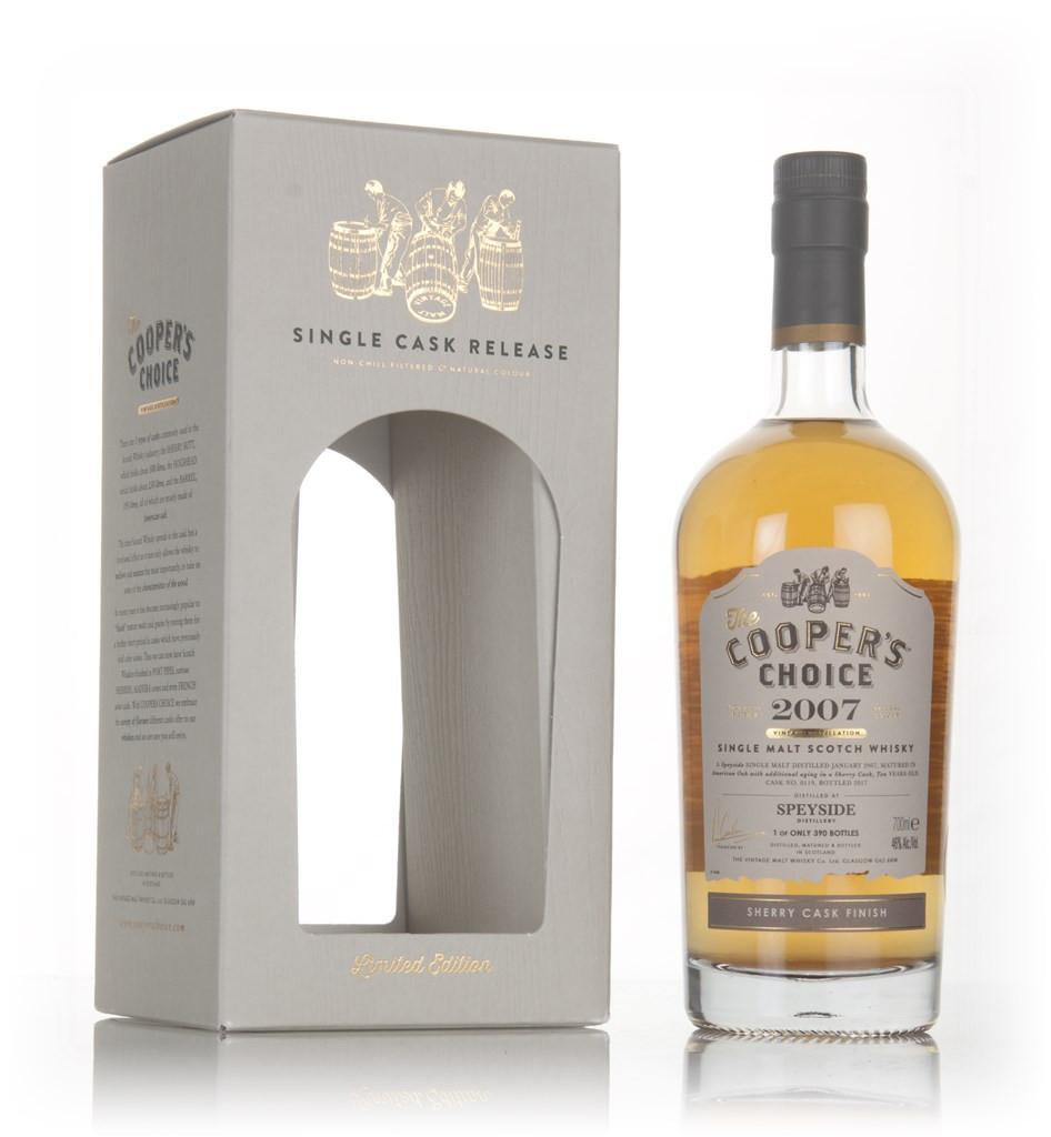 A 10 year old single malt from the Speyside distillery in the eponymous Speyside region, distilled in January 2007 and bottled in 2017 after a finishing period in a Sherry cask. This is yet another tasty Cooper's Choice from the Vintage Malt Whisky Co.'s selection, bottled with an outturn of 390 bottles.
