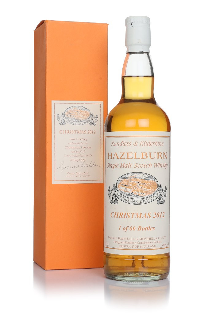 A festive bottle of Hazelburn, Springbank's triple-distilled, unpeated single malt – and a rare find for a collection. Part of a private release, just 66 bottles were produced for Christmas 2012, exclusively for the shareholders, directors, and staff of J. & A. Mitchell & Co.