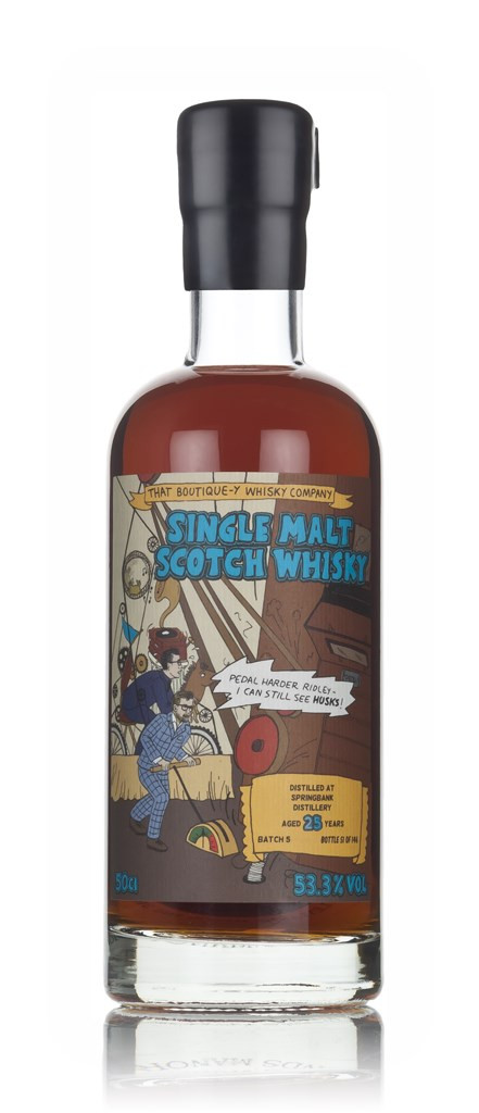 Here's the fifth batch of single malt Scotch whisky from Campbeltown's esteemed Springbank distillery, independently bottled by That Boutique-y Whisky Company. After this whisky spent 25 years maturing, those Boutique-y chaps bottled it up at 53.3% ABV, producing 146 bottles. Neil and Joel off of that there World's Best Spirits are hard at work getting the Rube Goldberg machine-esque Porteus Mill in gear on the label, and they won't be allowed to stop for a second until there isn't a husk in sight.