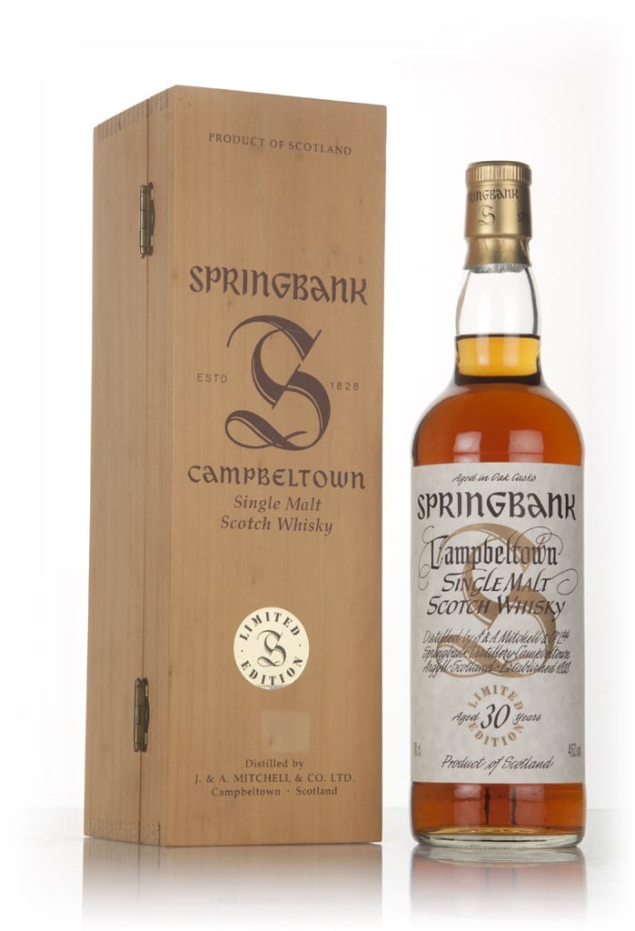 An incredibly rare and collectible bottle of 30-year-old Springbank single malt Scotch whisky, released as part of the Millennium Collection. This range of bottlings included a selection of well-aged whiskies from the Campbeltown-based distillery, from a 25-year-old to a 50-year-old (!).