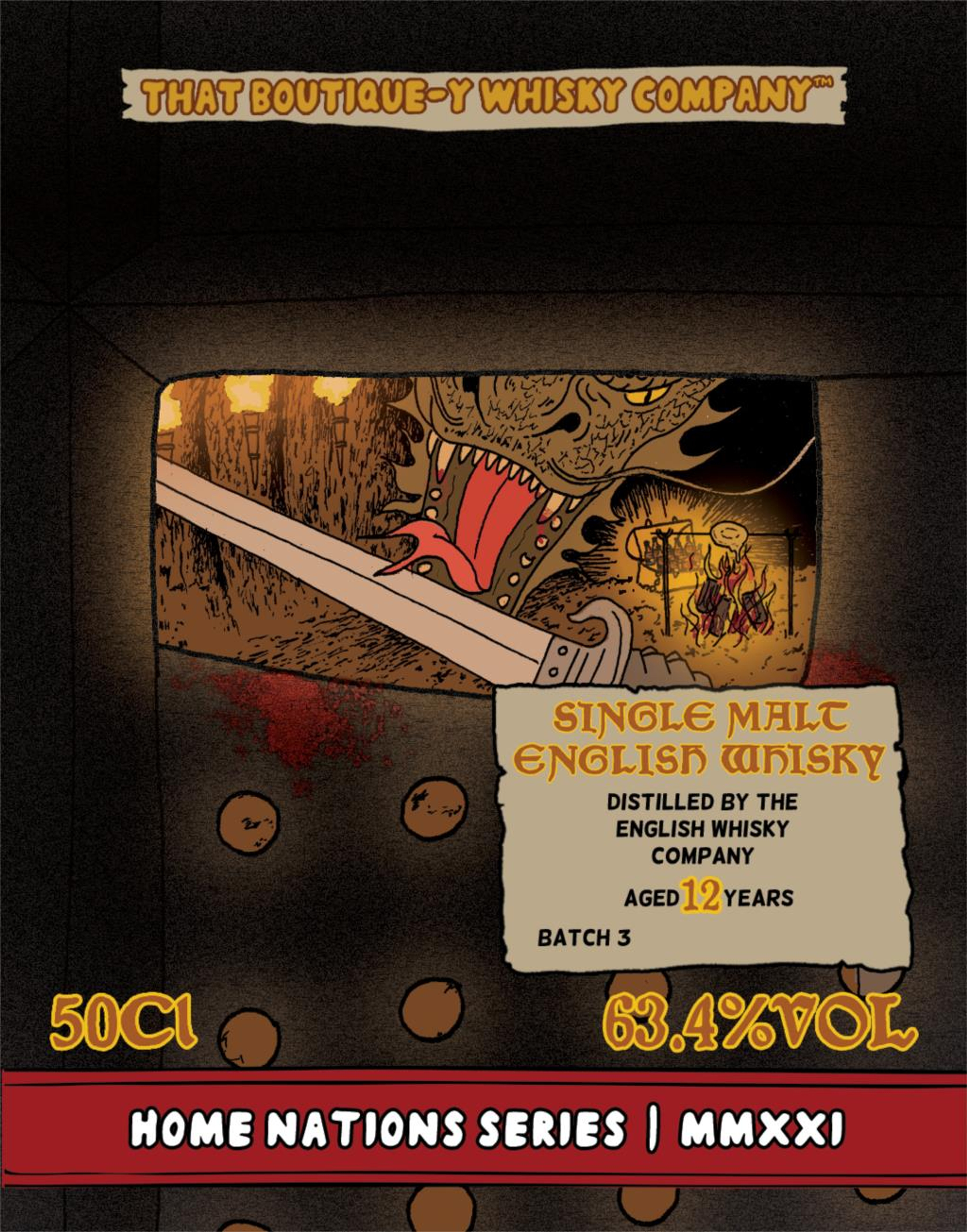 A 12 year old single malt from the English Whisky Co., independently bottled up by That Boutique-y Whisky Company! Just like the English Whisky Co.'s logo, the label of this one features a knight bravely facing down a fierce dragon, presumably going after its treasure, which seems to include a chest full of whisky bottles, and the greatest prize of all – a chicken roasting on a spit.