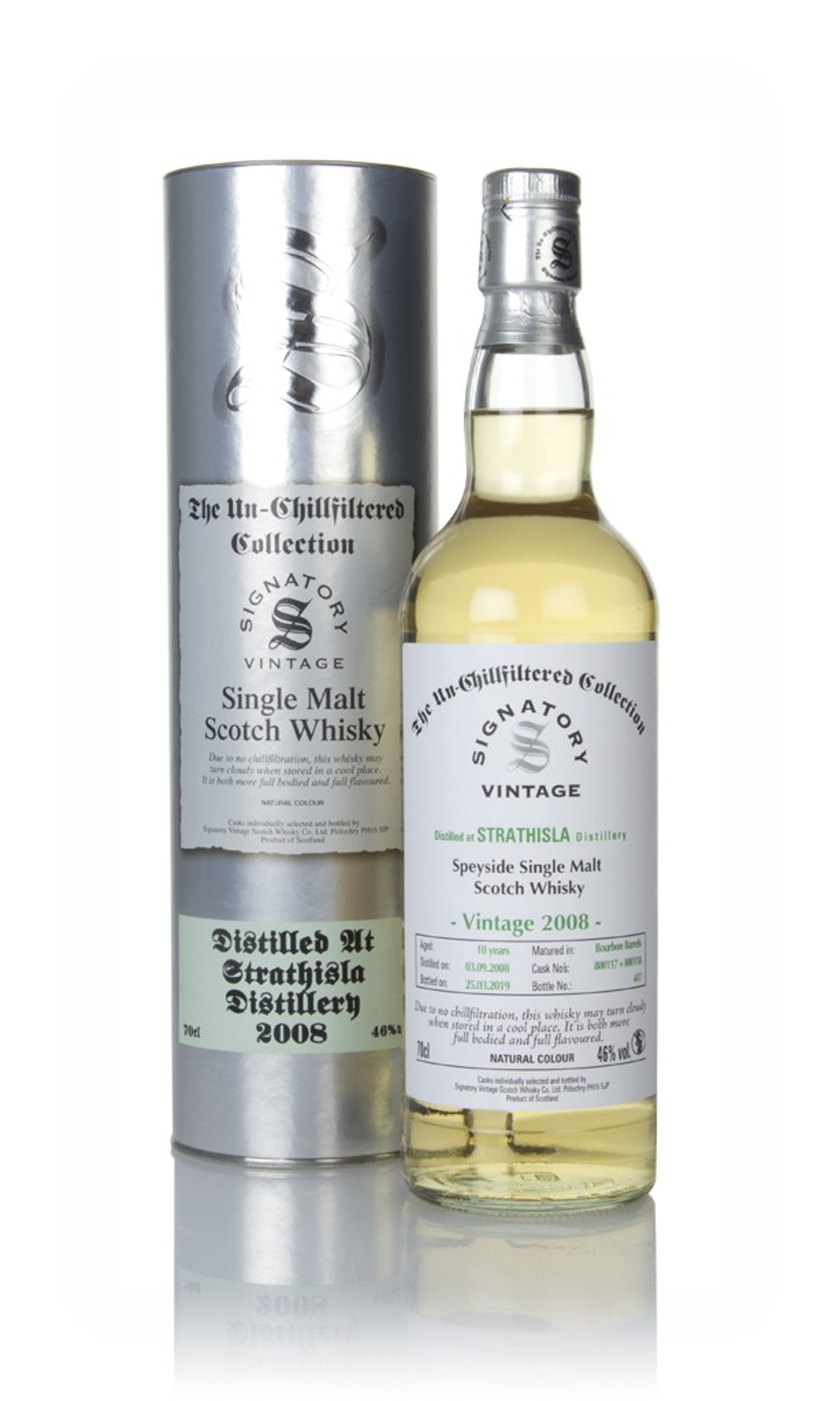 A 2008 vintage single malt from the Strathisla Distillery, one of the oldest active distilleries in the Highlands region. The single malt matured in a pair of bourbon barrels for 10 years, until it was bottled by Signatory in March 2019. It was released at 46% ABV as part of the Un-Chillfiltered Collection.