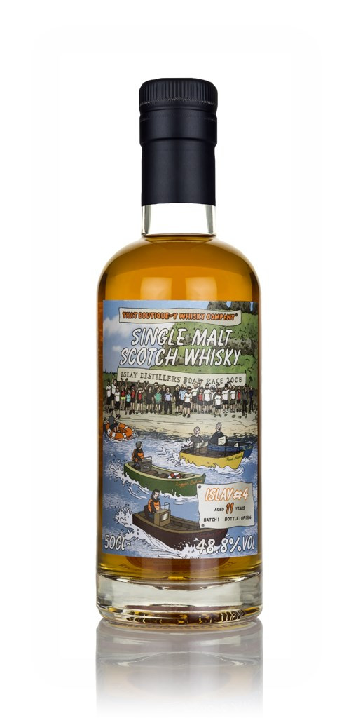 Another mysterious Islay single malt independently bottled by That Boutique-y Whisky Company! For Islay #4, the Boutique-y bunch have adorned the bottle with a scene from the Islay Distillers Boat Race 2008, with a few familiar faces from a few familiar Islay distillers setting sail in their trusty vessels. But who's that in last place? It's our very own Jake Mountain in his dinghy, putting paddle to the metal and getting nowhere fast.