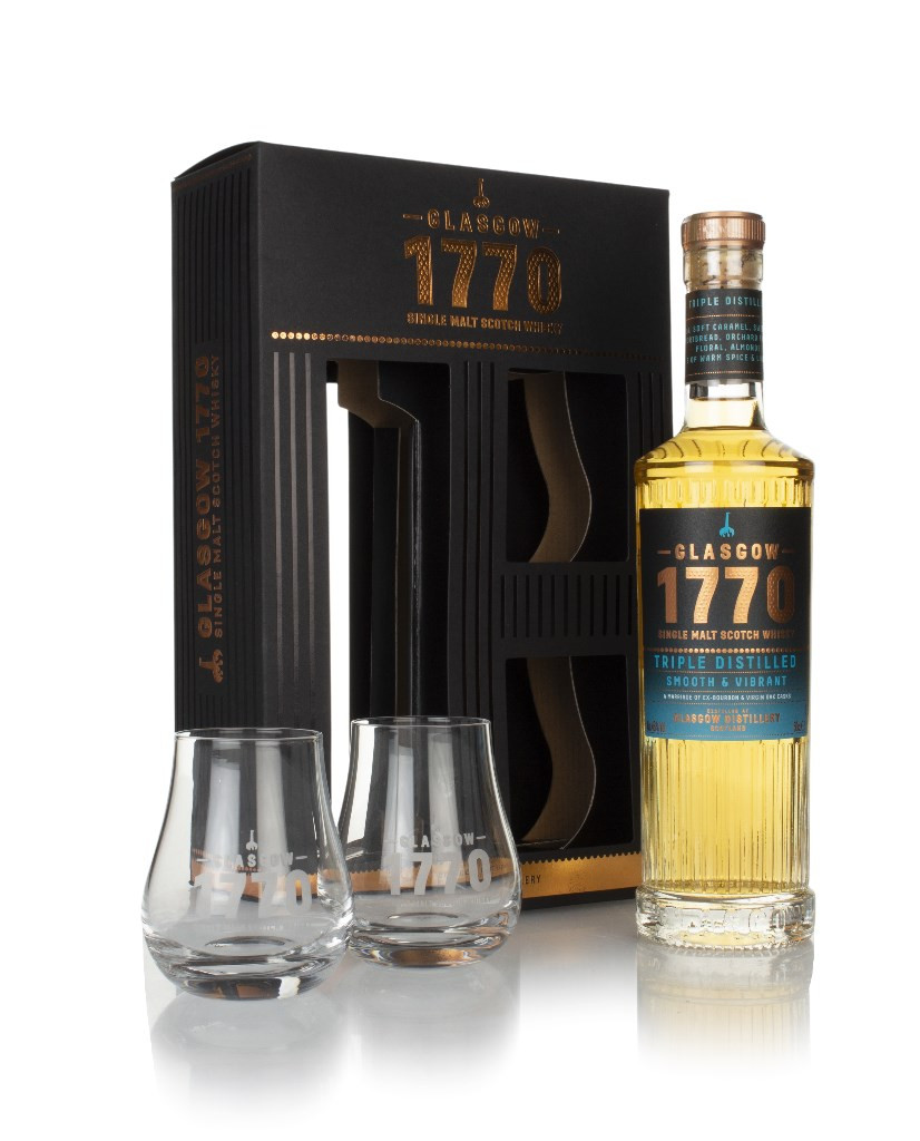 It's a tremendous gift pack of the Glasgow Distillery Company's 1770 Triple Distilled! Including a pair of delightful branded glasses, it's a perfect way to enjoy this fabulous single malt, which is matured in virgin oak and distilled, you guessed it – three times!