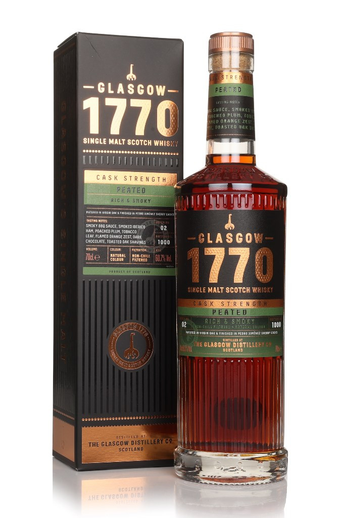 This is the second cask strength batch of Glasgow 1770 - Peated single malt from the Glasgow distillery. It's a marriage of three hogshead casks of the double distilled whisky, made with barley that has been peated to 50ppm, presented at a robust 60.7% ABV, and limited to 1,000 bottles.
