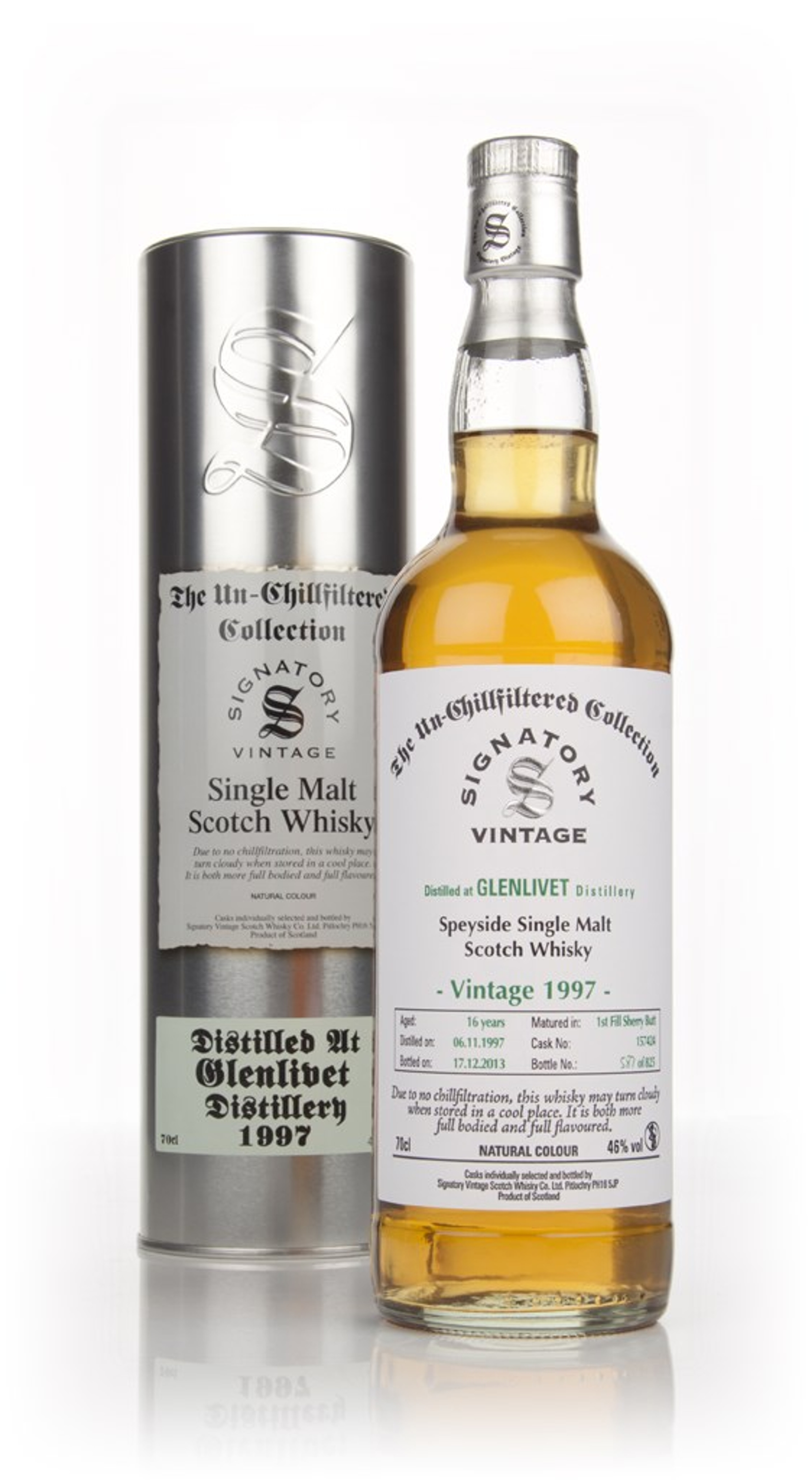 A Signatory bottling of Glenlivet single malt Scotch whisky, which has spent 16 years maturing in a first fill Sherry butt. To make sure none of those sweet, spicy flavours escaped, it was bottled without chill-filtration. A release of 825 bottles.
