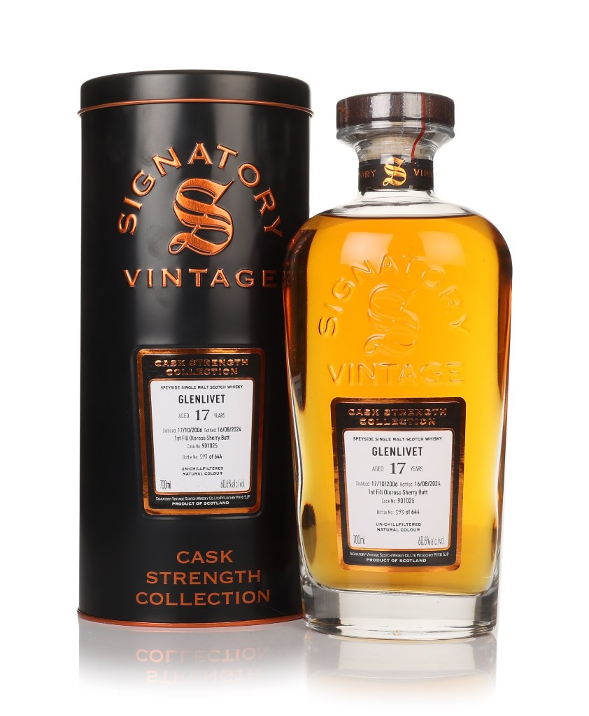 Presenting the Glenlivet Signatory Vintage Single Cask #901025, a 17-year-old single malt Scotch whisky distilled in 2006. It was aged in a first-fill sherry butt and bottled at a cask strength of 60.6% ABV. Just 644 bottles were filled in 2024 to join the Cask Strength Collection.