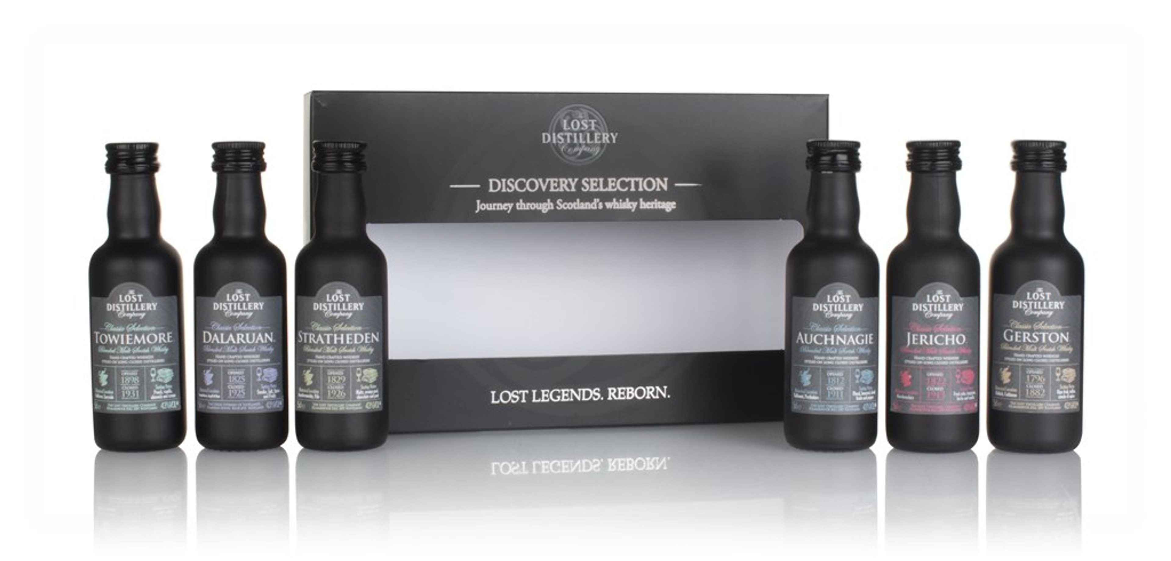 Want to explore how whiskies from long, long closed distilleries may have tasted? The Lost Distillery Company's range is for you! The folks at The Lost Distillery Company research how whiskies from distilleries that have been closed for many decades might have tasted, and create blended malts to show us what their flavour profiles could have been like. The Discovery Selection features six different history-exploring whiskies from the company's Classic Selection range, presented in 5cl bottles, including the Towiemore, Dalaruan, Stratheden, Auchnagie, Jericho and Gerston expressions.