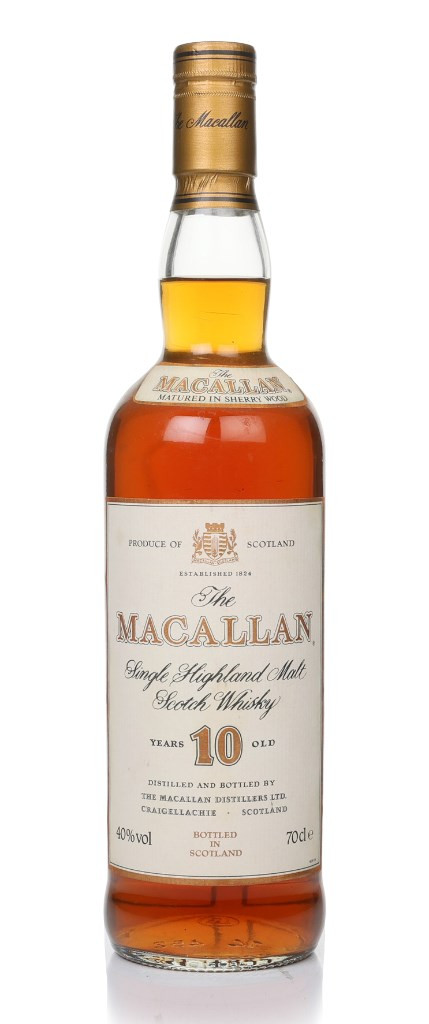 A bottling of 10 year old single malt from the highly-regarded Macallan distillery in Speyside, which we believe to have been released in the 1990s. A handsome, collectible bottle for a Macallan enthusiast or antique bottle aficionado.