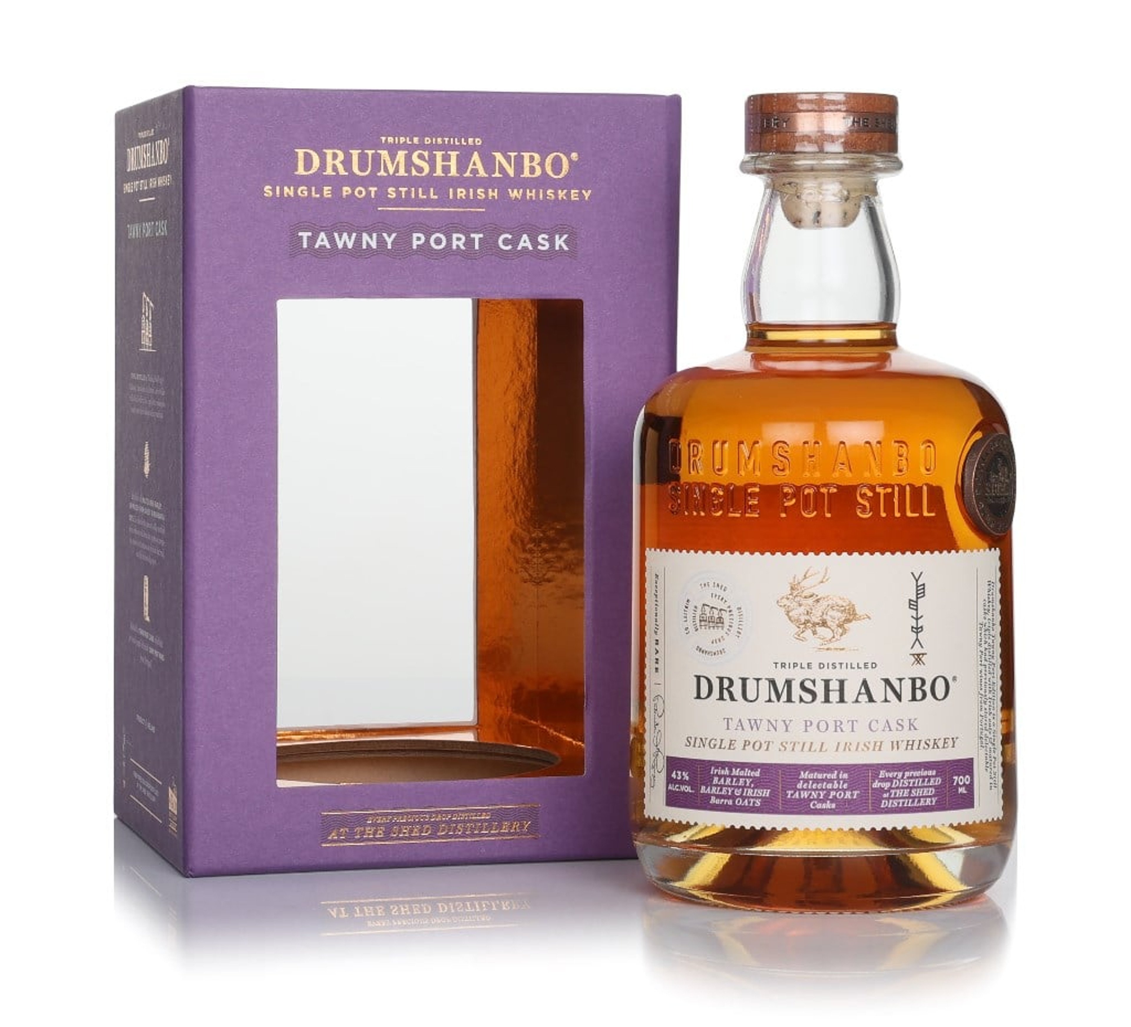 Triple distilled and crafted at The Shed Distillery, this seven-year-old single pot still whiskey has been aged in Tawny Port casks since 2018. A smooth, fruity Irish whiskey with a lovely nutty sweetness and Port-rich depth.