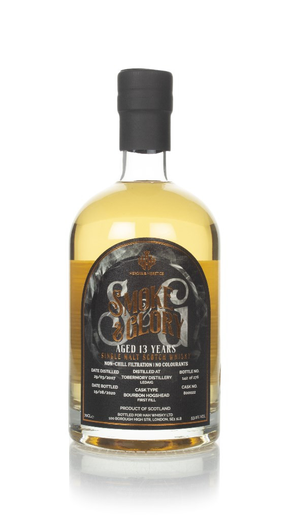 A smoky Ledaig single malt from Tobermory here! Distilled in March 2007, the whisky called a single first-fill bourbon hogshead home for the next 13 years, until Heroes & Heretics bottled it in August 2020. The cask yielded 276 bottles at 53% ABV for the aptly-named Smoke & Glory series.