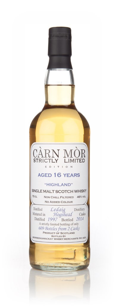 An indie bottling of peated single malt from the Tobermory distillery, released under the Ledaig name (as all their peated whiskies are). It was distilled in 1997 and matured in 2 hogshead casks for 16 years, until it was bottled by Càrn Mòr in 2014. 609 bottles were produced for the Strictly Limited range, and as the name suggests, when they're gone, they're gone (so if you're a Ledaig lover, get your bottle before then!).