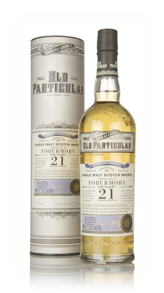 A 21 year old single malt from the isle of Mull's Tobermory distillery, drawn from a refill hogshead that was laid down in October 1996. In May 2018, this cask was cracked open and drained of its whisky, which was bottled by Douglas Laing for the Old Particular range. 260 bottles were produced.