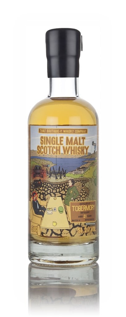 This is That Boutique-y Whisky Company's fourth batch of unpeated Tobermory single malt. You can tell it's unpeated because the Alan Partridge character called Pete has a red line through his face as a bunch of torches attached to a bicycle wheel and some car hazards provide lighting and pyrotechnics.